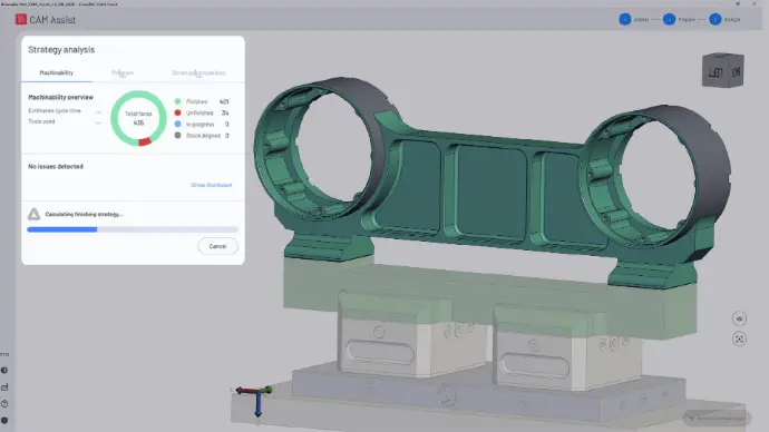 CAM Assist la AI para Mastercam identifica las existencias que faltan, las características no compatibles y los problemas de geometrías antes de generar las trayectorias de herramienta, y le muestra lo que hay que arreglar-