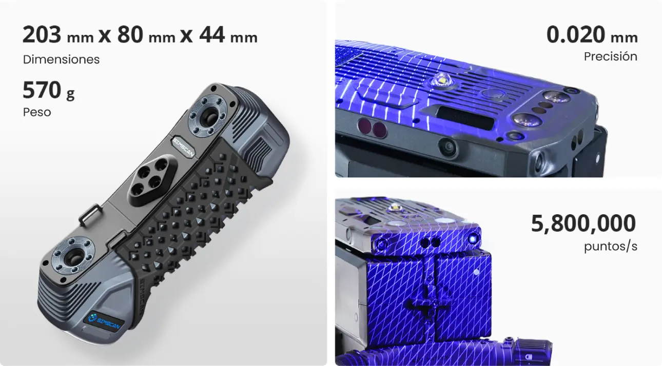 Gracias a sus avanzados algoritmos y 27 cruces láser, SIMSCAN ofrece una rápida captura de datos con una velocidad de medición de hasta 5,8 millones de puntos/s. Reconocido con los premios alemanes Red Dot y China Design Silver Awards, destaca como una herramienta elegante, eficiente y fácil de usar, ideal para profesionales y principiantes en el escaneado 3D de alta precisión.