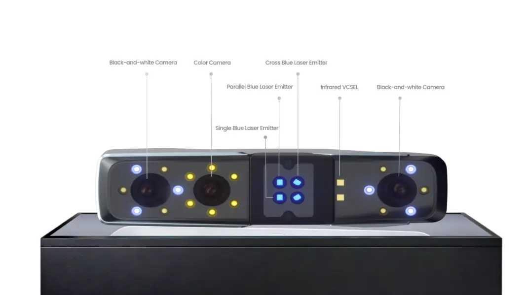 | Fuentes de luz | 34 líneas láser azules en cruz | 11 líneas láser azules paralelas | 1 línea láser azul simple | Luz estructurada VCSEL infrarroja |