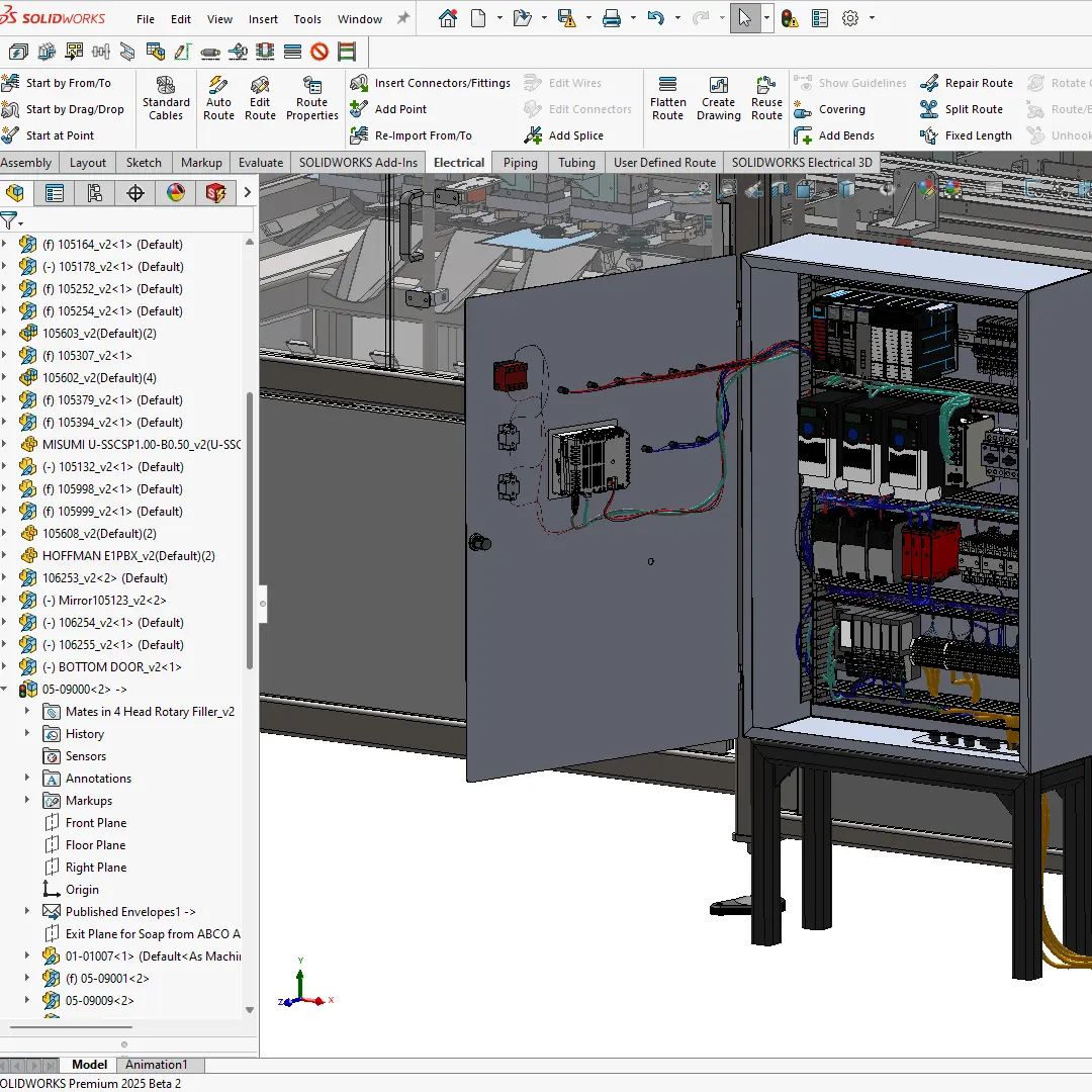 Incorpora tecnología de SolidWorks Routing para el recorrido automático de alambres, cables y mazos en CAD 3D, respetando rutas y reglas de segregación y acelerando el diseño.